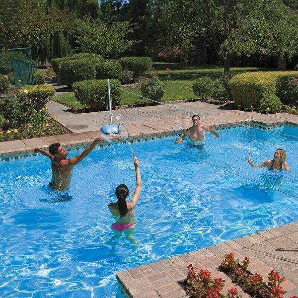 - Poolmaster’s Across-Pool Volleyball / Badminton Game Combo offers two popular outdoor sports to be played and enjoyed in the water. The set includes 22′ wide Nylon volleyball net with four upright poles, one deluxe game ball with inflating needle, two game bases that can be filled with water or sand for poolside stability, and deluxe set of metal badminton rackets and birdies.
